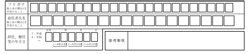 交代・解任の際は、「前任者氏名・フリガナ」および「辞任、解任等の年月日」欄に、解任または交代する産業医の氏名と、その年月日を記入します。