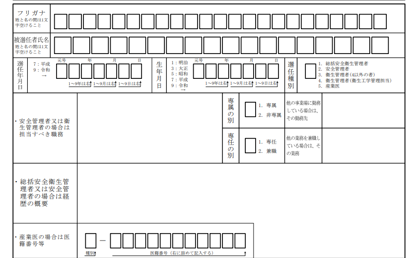 一般に「選任届」と呼ばれることもあり、総括安全衛生管理者や衛生管理者などを選任する際にも共通して用いられます。また、産業医を交代・解任する場合にも使用される様式です。