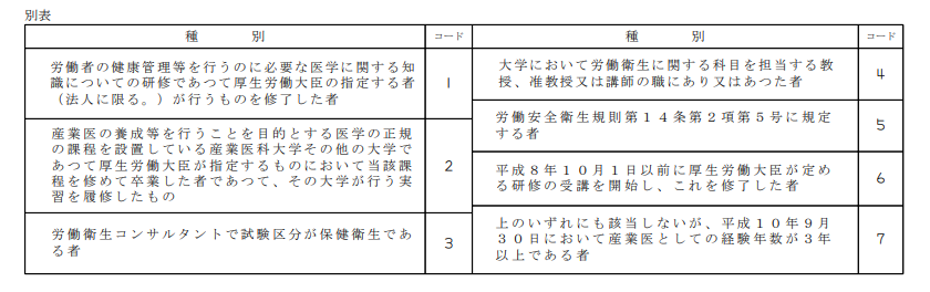 「産業医の場合は医籍番号等」には種別と医籍番号を記入します。種別は、別表に掲げる種別の区分に応じて該当コードを記入する必要があります。