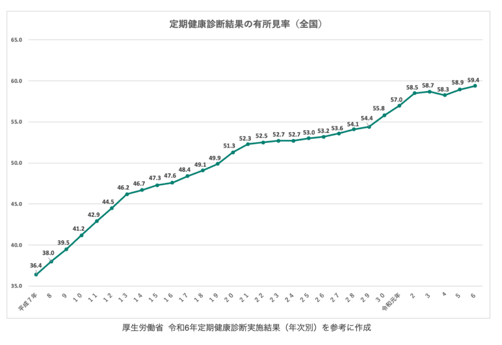 健康診断の事後措置は、単に異常を見つけることだけではなく、従業員の健康障害を未然に防ぎ、重症化を予防しながら、安心して働き続けられる環境を整えることが目的です。近年、従業員の高齢化や働き方の多様化により、治療と仕事を両立しながら就業する人が増え、定期健康診断の有所見率も上昇傾向となっています。
