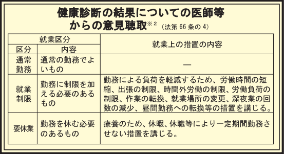 医師等は、健康診断の結果に基づき、「通常勤務」「就業制限」「要休業」といった就業区分ごとの意見を企業に示します。